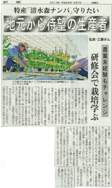 同校は清水森ナンバの栽培から加工まで取り組んでおります。既に清水森ナンバを利用した加工品で「第2回ご当地グルメ!絶品うまいもん甲子園」第一次審査を合格し、2次審査(会場は仙台で東北大会)に挑戦することが決定しております。8月21日11:00〜14:30仙台市ガス局ショールーム ガスサロンにて開催されます。応援しております。