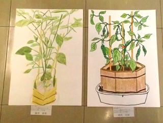 「8月までは青トウガラシを食してください。」とお願いしているので、写生には大変苦労されたことと思います。一部の生徒さんの作品を紹介させて頂きます。尚、担当の笹森先生からは、青トウガラシの生育画像だけでなく赤トウガラシの写生にしたかったとお話がありましたが、今の旬は青トウガラシですので、青で食べていただく様にお願いしました。。