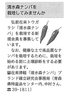 | 2019年12月25日更新 清水森ナンバブランド確立研究会より 弘前市、西目屋村、大鰐町、平川市、田舎館村の方への募集となります。 ◇問い合わせ先 在来津軽「清水森ナンバ」ブランド確立研究会事務局 (青森県特産品センター内 中村 TEL 39-1811) |