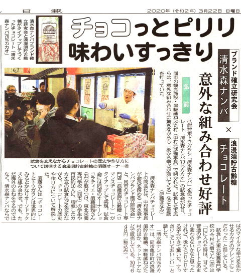 | 2020年3月14日更新 試食販売会では、チョコレートを手掛けた当会の「浪漫須貯古齢糖(ロマンスチョコレート)」須藤会員に解説を依頼。 弘前市の東北栄養専門学校の生徒さんや教員らが参加し、チョコレートについての由来や生カカオ豆・焙煎カカオ豆2種を手で割ってカカオマス(砂糖なし)を試食。チョコレートの魅力について須藤氏の解説にとても興味を持ってくれた様子。 『清水森ナンバ』と『カカオ豆(「マダガスカル」と「トーゴ」の2種類を混合)』を使用し、出来上がったチョコレートについてこだわりを話してもらいました。 参加者の皆さんに伺ったところ、「日本酒にも合う」 との感想をいただきました。 ▼ 取材 テレビ局はNHK・ATV・ABA、新聞社は読売新聞社・東奥日報・陸奥新報、他アップルウエーブ。 ▼ 販売場所 ・青森県特産品センターアンテナショップ東京店(東京都中央区新富1-3-9) ・津軽藩ねぷた村売店(青森県特産品センター弘前店・弘前市亀甲町61) ◎清水森ナンバチョコレート【SHIMIZUMORINANBA】30g 648円(税込) |