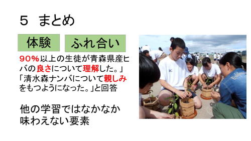 | 「地域資源を利用した教材開発と運用について」 ~青森ヒバの鉢で地域野菜『清水森ナンバ』を育てる教材の取り組み~ 〇笹森賢司(弘前市立津軽中学校) 中村元彦(在来津軽清水森ナンバブランド確立研究会) 岡部敏弘(神奈川大学理学部) |